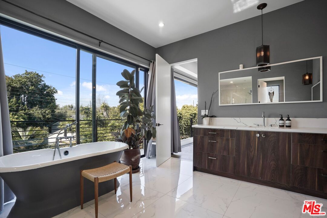 Experience luxury living in this custom built home by Thomas James Homes, designed with precision and crafted to meet your needs. Featuring five bedrooms, six baths, and a stunning pool with a spa, this home is a paradigm of modern living. As you step inside, you are greeted by elegant wide plank oak flooring that sets the stage for a beautifully appointed interior. The first floor is an entertainer's dream, featuring a guest suite, a study, a powder bath, and a formal dining area. The chef's kitchen is a masterpiece of design, with sleek flat panel cabinetry, quartz countertops, a butler's pantry, a spacious walk-in pantry, and an eat-at island with waterfall edges. Top-of-the-line stainless steel appliances complete this gourmet space. The great room, ideal for gatherings, boasts a cozy fireplace and quad stacking Fleetwood doors that create a seamless indoor/outdoor ambiance. Ascend to the upper floor where you will find three additional secondary bedrooms, each with its own en-suite bathroom and a convenient laundry room. The luxurious master suite is a private sanctuary, featuring a fireplace, a balcony with stacking Fleetwood doors, and a spa-like bath with a freestanding soaking tub, a walk-in shower with a seat, and a spacious walk-in closet. The inviting backyard is a true oasis, designed for both relaxation and entertainment. It features a beautiful pool with an integrated spa, surrounded by lush landscaping and an array of fruit-bearing trees including Meyer Lemon, Valencia Lemon, Pink Variegated Eureka Lemon, Grapefruit, Orange, Apricot, and Plum. A vibrant Passion fruit vine and a flourishing herb garden with parsley, cilantro, thyme, chives, and basil add a fresh touch. The outdoor kitchen and dining area, complemented by stunning bougainvillea in four colors, make this the perfect setting for hosting gatherings or enjoying peaceful afternoons. Situated in the prestigious neighborhood of Mar Vista, this home not only offers elegance and comfort. Don't miss the chance to own this exquisite property.